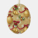 This ornament features a joyful Christmas pattern filled with sparkling gold baubles, shiny bells, red bows, holly leaves, and delicate white snowflakes. The warm golden background gives the design a cozy, classic holiday glow, while the bright red accents add a cheerful pop of color. Each element is beautifully detailed, creating a lively and festive winter scene that feels both traditional and elegant.