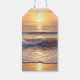 This is a serene and painterly depiction of a sunset over the ocean. The image captures the golden hour, with a bright sun descending and reflecting intensely on the water's surface, creating a sparkling path to the shore. Warm hues of orange, yellow, and soft pink dominate the sky and clouds. The foreground shows an active shoreline with waves breaking, rendered in beautiful detail with white foam and sea spray washing over the wet, sandy beach. Distant mountains or islands frame the horizon, adding depth. The style appears to be digital painting or oil/acrylic on canvas.