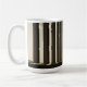 Moderne architektonische Kolonnade mit hohen senkrechten Säulen, die in goldener Stunde lange diagonale Schatten werfen; einsame Figur in der Entfernung - minimalistische Tasse. Ruhe, warmes Licht trifft auf präzise Geometrie. Große Säulen schneiden knusprig, diagonale Schatten über den Boden, was das Auge in Richtung einer einsamen Silhouette und eines offenen Himmels führt. Die goldene Farbpalette und die minimalistische Komposition verleihen kreativen Schreibtischen, Studios und modernen Küchen einen ruhigen Fokus - ein elegantes Geschenk für Architekten, Designer und Liebhaber sauberer Linien.