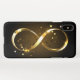 Gold, Schmuck-Unendlichkeitssymbol mit goldenen Sternen auf schwarzem Hintergrund. Design mit Goldstar.