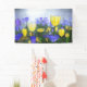 Sonnige, gelbe und blaue Tulpen ragen an einem coolen Frühlingmorgen auf einem Feld hervor. Im frühen Sonnenlicht sehen sie sich wie goldene Tassen des Lichts aus.