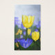 Sonnige, gelbe und blaue Tulpen ragen an einem coolen Frühlingmorgen auf einem Feld hervor. Im frühen Sonnenlicht sehen sie sich wie goldene Tassen des Lichts aus.