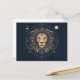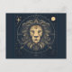 Eine kraftvolle und elegante Grafik mit einer stilisierten, detaillierten Abbildung des Löwenkopfes, des Symbols für das Leo zodiac-Zeichen. Die goldene Linienkunst ist umgeben von Himmelselementen, wie Sternen und Sternbildern, die alle Set vor einem dunklen, mystischen Hintergrund bilden.