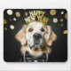 Ein goldener Retriever in einer schwarzen Smoking- und Bogen-Krawatte trägt ein festliches "Happy New Year"-Headband