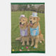 Dieses Geschirrtuch kennzeichnet die goldenen Retriever, die oben gekleidet werden und gehend auf eine Ostereijagd.