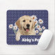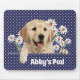 Niedlicher goldener Retriever mit weißen Gänsebläschen auf blau-weiß polka dot pattern. Der Name kann bearbeitet oder gelöscht werden.