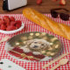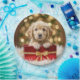 Ein niedlicher Golden Retriever Welpe flüchtige Blicke aus einer roten Geschenkboxen mit goldenem Band, Set vor einem Hintergrund festlicher, verschwommener Weihnachtsbeleuchtung.