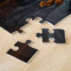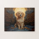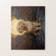 Ein goldener RetrippWelpe sitzt majestätisch mit großen, featherischen Flügeln dahinter. Die Flügel sind eine Mischung aus Blau und Gold, mit aufwändigen Details auf jeder Feder. Der Welpe hat ein weiches, goldenes Fell und schaut direkt mit unschuldigen, seelenvollen Augen auf den Betrachter. Der Hintergrund ist ein dunkler, schattiger Raum mit einem Hauch von Licht, das von einem bunten Fenster hinter dem Welpen kommt. Ideal für Golden Retrivers Liebhaber.
