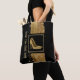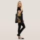 Chic all purpose tote Tasche in schwarz, mit Grafiken von goldenen Glitzer und goldene Farbstriche gemacht. Ein dekorativer, quadratischer schwarzer Bereich, in der Mitte der Tasche, hat ein elegantes Paar goldener High Heels. Golden tan Text liest, Haben Sie Schuhe werden reisen, und kann personalisiert sein, zu lesen, was Sie gewollt.