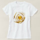 Ein T - Shirt mit einem goldfarbenen, sonnenförmigen Kunstwerk mit abstrakten Wirbel.