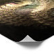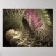 Fraktal art showing feathered golden Spiral on black background and pink and Green details.