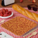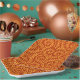 Seamless repeating pattern featuring stylized golden yellow leafy vine motifs against a rich terracotta red background.