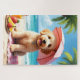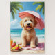 A fluffy Goldendoodle relaxing in a bright beach setting with tropical fruits and ocean views. The painterly detail creates a soft and cheerful coastal feel.