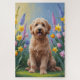 Ein fröhlicher Hund sitzt friedlich auf üppig grünem Gras, umgeben von bunten Frühlingsblüten unter einem weichen blauen Himmel. Dieses digitale Ölgemälde erfasst einen ruhigen Moment mit ausdrucksvollen Pinselstrichen, warmen Farben und einem Gefühl sanfter Freude.