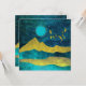 Abstraktes Gebirgslandschaftsdesign in kühnen Goldtönen, Zyantönen und Blau mit einem Mondschein, Sternen und Vögeln.