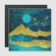 Abstraktes Gebirgslandschaftsdesign in kühnen Goldtönen, Zyantönen und Blau mit einem Mondschein, Sternen und Vögeln.