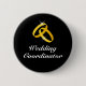 Hochzeitskoordinator/-planer pinback Knopf für Hochzeiten, Brautparty, die Hochzeits-Empfänge und die Abendessen-Proben. Schwarzer und goldener Ringentwurf. Personalizable Text und Hintergrundfarbe. Elegante Skripttypographie.