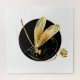 Künstlerisch bemalt, Gold, Schmuck, funkelnde Libelle mit detailreichen filigranen Flügeln auf goldener wilder Blume, gegen schwarz strukturierte Kreis. Goldene Libelle