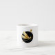 Künstlerisch bemalt, Gold, Schmuck, funkelnde Libelle mit detailreichen filigranen Flügeln auf goldener wilder Blume, gegen schwarz strukturierte Kreis. Goldene Libelle