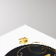 Künstlerisch bemalt, Gold, Schmuck, funkelnde Libelle mit detailreichen filigranen Flügeln auf goldener wilder Blume, gegen schwarz strukturierte Kreis. Goldene Libelle