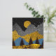 Abstraktes Berglandschaftsdesign in kühnen Goldtönen, Schwarz und Blau mit Mondschein und Vögeln.