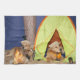 Dieses Küchentuch kennzeichnet goldene Retriever in einer Campingsszene. Ein golden retriever röstet Eibische durch das Feuer, während das andere Goldene heraus im Zelt hängt.
