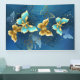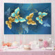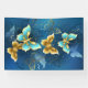 Zusammensetzung aus Fliegen, Schmuck, Gold und dunklen Schmetterlingen auf texturiertem Schmuckhintergrund. Goldener Schmetterling.