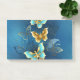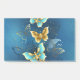Zusammensetzung aus Fliegen, Schmuck, Gold und dunklen Schmetterlingen auf texturiertem Schmuckhintergrund. Goldener Schmetterling.