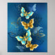 Zusammensetzung aus Fliegen, Schmuck, Gold und dunklen Schmetterlingen auf texturiertem Schmuckhintergrund. Goldener Schmetterling.