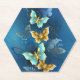 Zusammensetzung aus Fliegen, Schmuck, Gold und dunklen Schmetterlingen auf texturiertem Schmuckhintergrund. Goldener Schmetterling.