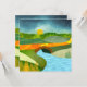 Abstrakte Landschaft eines Flusses unter einer Steinbrücke mit sanften Hügeln und einer goldenen Straße in kühnen Farben und Texturen.