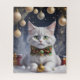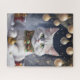Dieses Rätsel zeigt eine weiße Katze mit einem grünen und goldenen Schlips, die vor Weihnachtsgeschenken und Goldverzierungen im Schnee sitzt.
