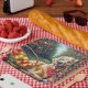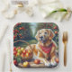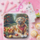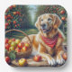 Ein goldener Retriever mit roter Bandana befindet sich neben einem Korb aus Äpfeln in einem Obstgarten