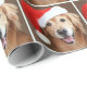 Fügen Sie einen kleinen golden retriever Weihnachtsbeifall Ihren Feiertagspaketen dieses Jahr hinzu! Dieses Verpackungspapier kennzeichnet eine Fotografie eines lächelnden Hundes des goldenen Retrievers, der eine rote Weihnachtsmannmütze trägt.