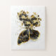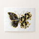 Goldener Schmetterling mit schwarzem Schmuckorchid, mit goldenen Blätter auf weißem Hintergrund dekoriert.