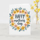 Diese Muttertags-Karte zeigt einen kreisförmigen Kranz aus stilisierten Blumen und Blättern auf weißem Hintergrund, der die Nachricht in einer sanften, liebevollen Umarmung umschließt ❤️. Das Wort „HAPPY“ sitzt oben in einer dunklen, dicken Schriftart, während „mother’s day“ direkt darunter in einer fließenden, kursiveartigen Schrift erscheint, um einen weicheren, zarteren Kontrast zu schaffen. Der Kranz mischt sonnengelbe Blüten mit rosafarbenen Blumen und suggeriert die Art von warmer Nähe, die man bei einer langen Umarmung oder einem süßen, verständnisvollen Blick teilt 🌼. Teal-farbene, längliche Blätter winden sich zwischen den Blüten und geben dem Ring einen ruhigen, stetigen Rhythmus, der wie unterstützende Begleitung wirkt. Kleine schwarze Punkte sind um die Anordnung herum verstreut wie Konfetti und fügen eine leichte, freundliche Energie hinzu, ohne das Zentrum zu überfüllen. Winzige goldene, sternförmige Markierungen glänzen zwischen Blütenblättern und Blät