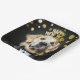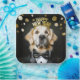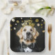 Ein goldener Retrivalhund, der in einem formalen schwarzen Smoking und Bugs-Krawatte gekleidet ist, trägt ein festliches "Happy New Year"-Headband.