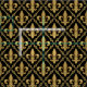 Dieser einzigartige Stoff zeichnet sich durch ein elegantes Muster von goldenen Fleur-de-lis-Symbolen in einem rautenförmigen Gitter von dekorativen Scrollwork aus.