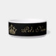 Ein personalisierter Teller für Ihre Haustierprinzessin, -hund oder -katze, mit ihrem Namen in der schönen Skripttypographie und im hübschen Gold druckte Glittereffektkronen auf einem schwarzen Hintergrund.