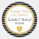 Elegante Hochzeitsaufkleber beginnen mit schwarz-weißen Streifen, um eine Atmosphäre der Eleganz zu schaffen. Gold Glitzer Rahmen fügt Glamour und ein goldenes Herz fügt einen romantischen Flair hinzu. Danke, dass du gekommen bist, ist in Gold geschrieben. Die Braut- und Bräutigamen werden in einem hübschen Schriftart geschrieben, mit dem unten angegebenen Hochzeitstermin. Diese schicken und stilvollen Hochzeitsaufkleber werden wie Hochzeitsdekorationen, Gastgeschenk-Siegel, Hochzeitskartons-Siegel oder auf Dankeschön-Noten großartig aussehen.