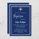 Modernes, elegantes und einladendes Hotel. Ein marineblau-blauer Hintergrund mit weißen Rahmen und einem goldenen Kreuz. Personalisieren und fügen Sie einen Namen und Details. Weißer Text.