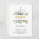 Dieses Bild zeigt eine schön gestaltete Taufeinladung. Die Spitze der Einladung ist ein einfaches, elegantes Kreuzsymbol, das die Christliche Bedeutung der Veranstaltung verdeutlicht. Unterhalb des Kreuzes befindet sich eine üppige Anlage von Aquarellgrün, die in verschiedenen grünen Blätter gestaltet ist und dem Design eine natürliche und frische Touch verleiht. Der Text ist sorgfältig mit einer Mischung aus klassischen und modernen Schriftart gestaltet und unterstreicht die Einladung, an einer Taufveranstaltung teilzunehmen. Der Name des Kindes wird hervorgehoben angezeigt, wobei das Kind angegeben wird, das getauft werden soll. Die Veranstaltungsdetails sind klar angegeben und geben das Datum und den Ort an. In einem UAWG werden die Gäste gebeten, ihre Anwesenheit zu bestätigen, und es wird eine Telefonnummer zur Verfügung gestellt.