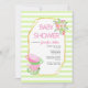 Goldfolie Polygon, Teetassen und Blume Tee-Party Mädchen Dusche Einladung. Es verfügt über rosa und grüne Teetassen, Blume und Blätter. Der Text ist in einem weißen Rahmen mit goldenem Polygonrahmen. Dahinter befindet sich ein Streifen mit blassgrünen und weißen Streifen.