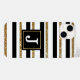 Modernes iPhone Gehäuse in einem schwarzen, weißen und goldfarbenen Glitzer mit gestreiftem Muster. Ein Schwarz-Gold-Textquadrat in der Mitte des Gehäuses verfügt über ein Monogramm mit weißem Single, das zur Personalisierung bereit ist.