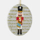 Kleine Schlagzeugerjungennussknackerentwurf Weihnachtsverzierung für Ihren Weihnachtsbaumdekor. Hellgrauer Hintergrund mit GoldTexten des kleinen Schlagzeugerjungenliedes im Skript, mit Nussknackerschlagzeugergraphik.