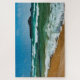 Dieses herausfordernde Rätsel zeigt ein wunderschönes Originalfoto des phantastischen goldenen Sandstrandes von Chia (im Süden Sardiniens - Italiens) und seine großen Wellen in allen Schattierungen von Blau und Grün, an einem windigen Sommertag, mit einer kleinen Insel in der Ferne