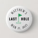 Dieser benutzerdefinierte Knopf enthält neben dem spielerischen Satz "Last Hole" auch ein Bild der Golfflagge, das es zu einem lustigen Accessoire für eine Bachelor-Party zum Thema Golf macht. Personalisieren Sie es mit dem Namen und dem Datum des Bräutigams für eine einzigartige und unvergessliche Touch. Ideal für den Bräutigam und seine Freunde, fügt dieser Knopf jedem Hochzeitsfest ein humorvolles und persönliches Element hinzu.