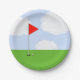 Golf Party oder Event-Teller mit rotem Flagstick auf dem Fairway für Golfer.