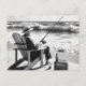 Dieses Bild zeigt einen älteren Mann, der auf einem Holzstuhl am Strand sitzt und verlobt beim Angeln ist. Er trägt einen Hut und erscheint entspannt und hält eine Angel. Neben dem Sessel befindet sich ein kleiner cooler und ein tragbarer Sand. Die Meereswellen sind im Hintergrund sichtbar, was auf Bewegung hindeutet. Der Himmel ist voll von Wolken, die die ruhige Atmosphäre der Szene noch verstärken.