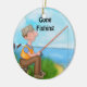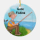 Man entspannt sich auf Baumstumpf mit seinem Angelpfahl, Wurm und Köder kann. Im Text steht "Gone Fishing". Wasser und blauer Himmelshintergrund.